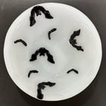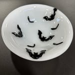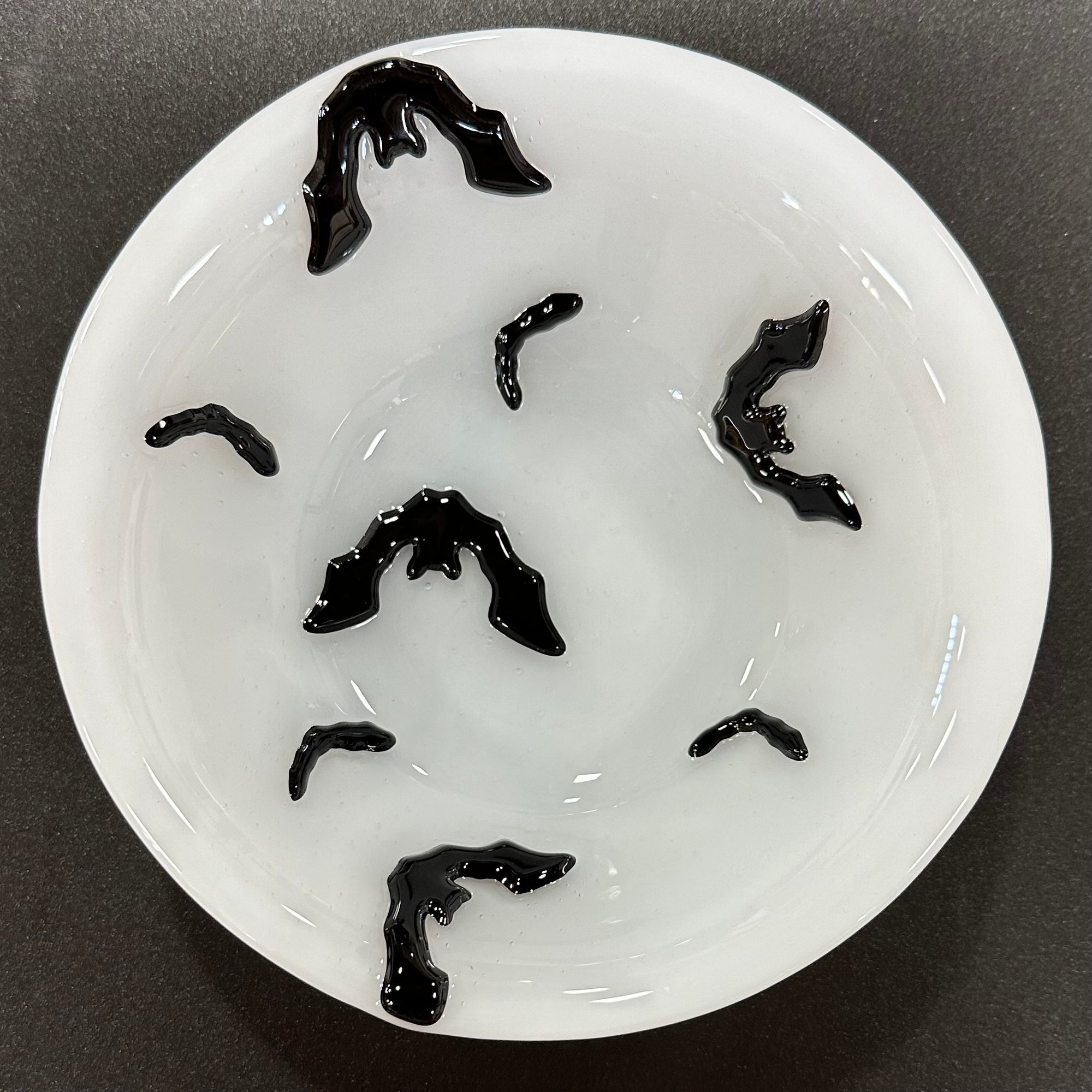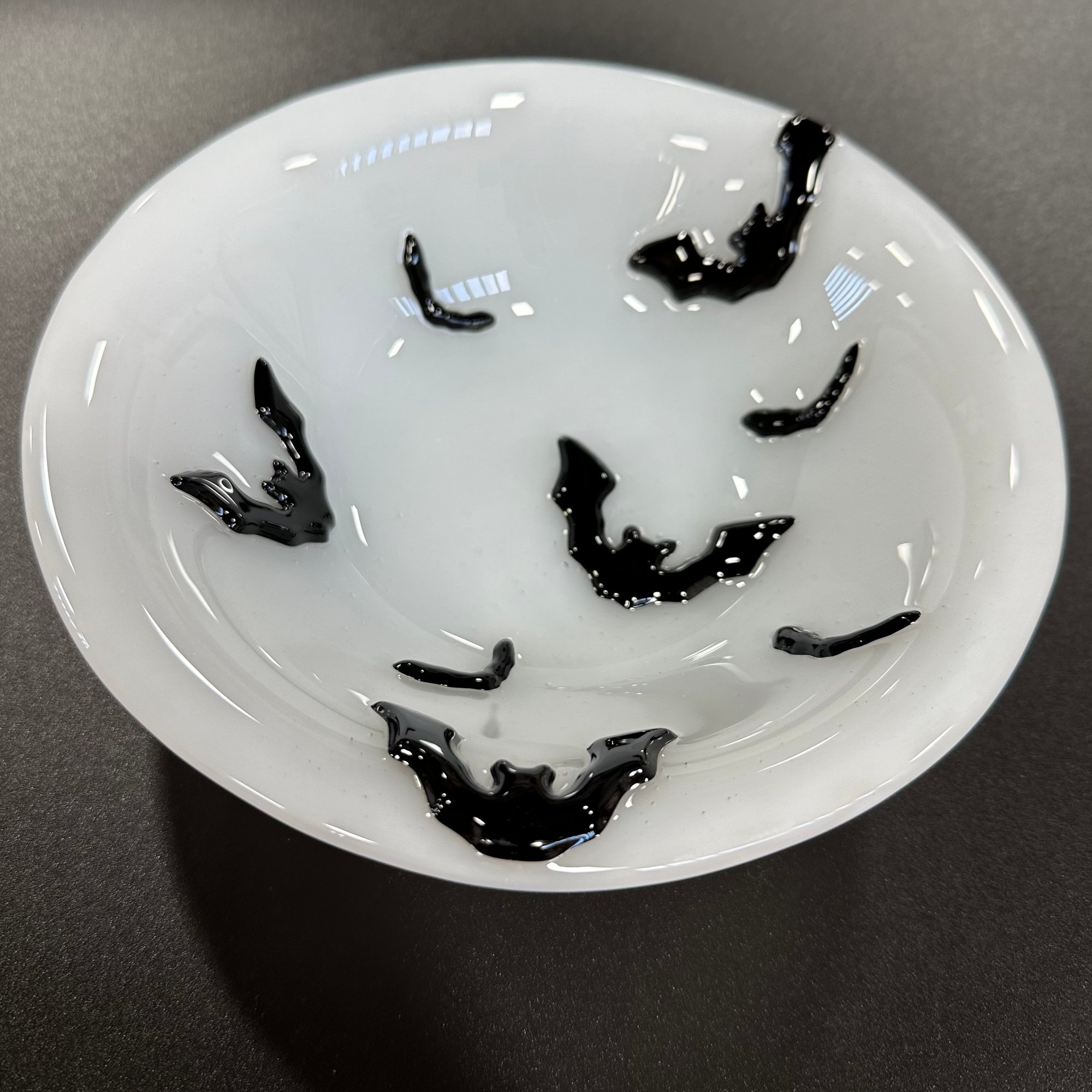 This glass bowl measures 7.5" in diameter. It is handmade and fused in a kiln.