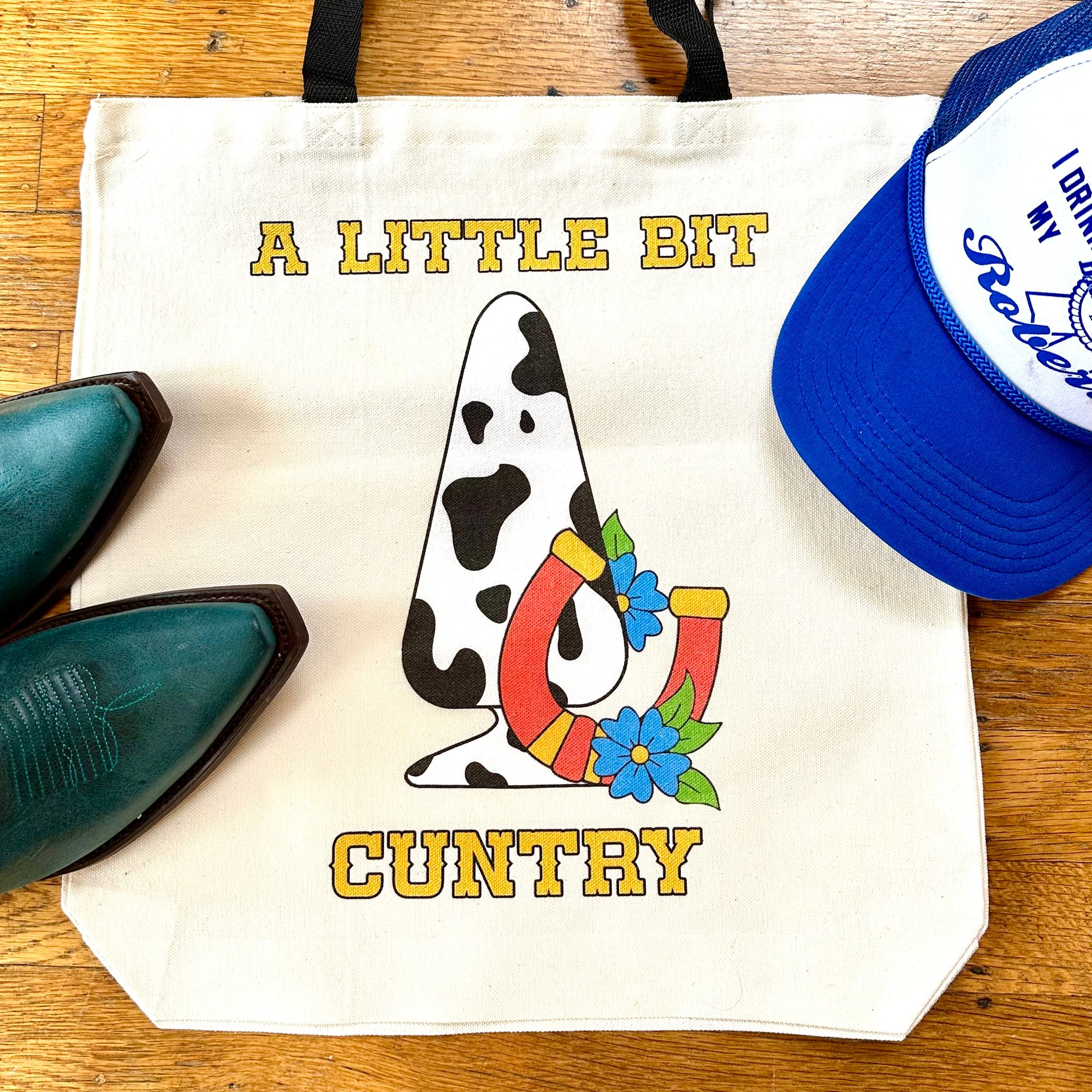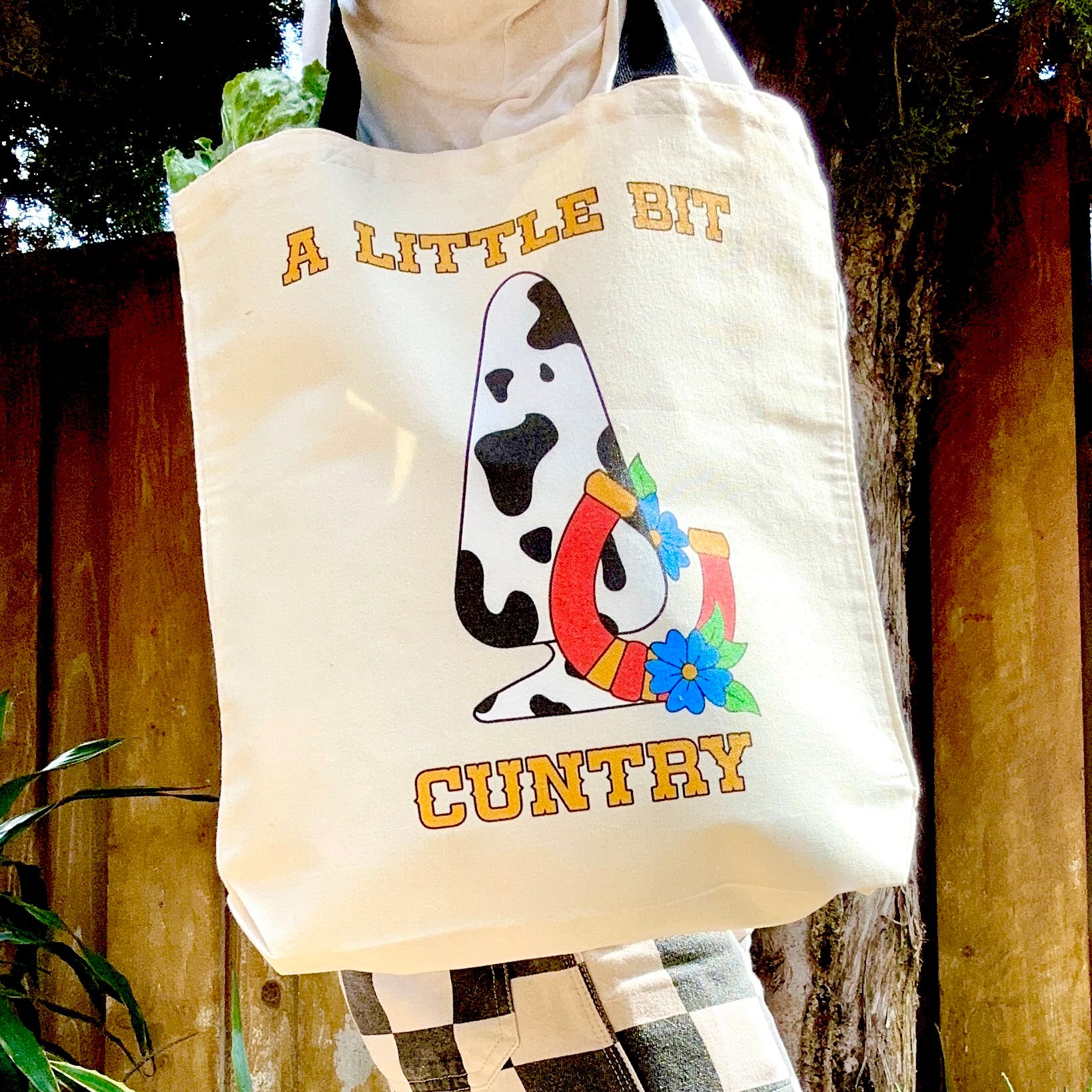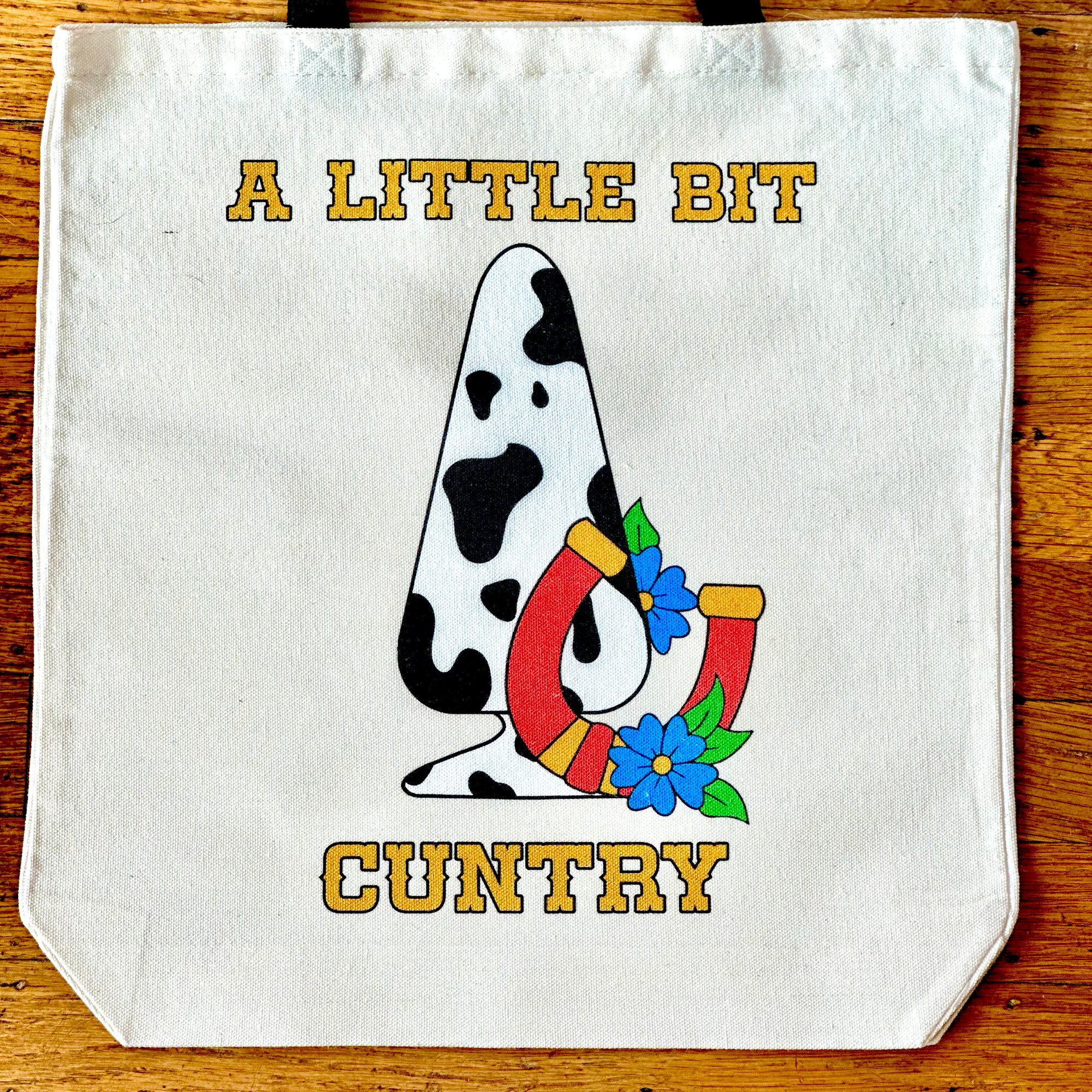 Giddy up and git a little bit cuntry with this cheeky tote! featuring a playful, cow-print (you know what it is) and a lucky horseshoe. This bag is sure to get you lucky. Made in the US from durable, high-quality canvas, it's roomy enough for all your daily essentials-whether you're hitting the honky-tonk, the farmers' market, or just stirring up some trouble.