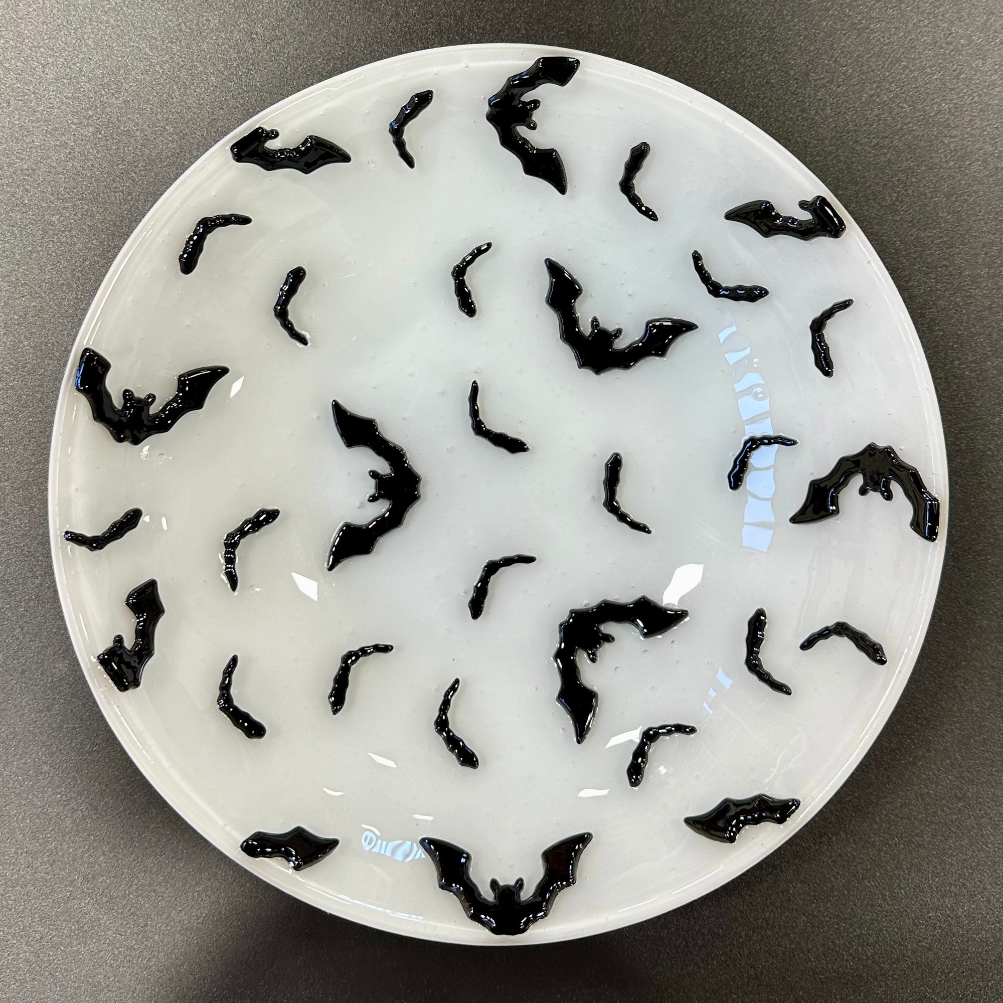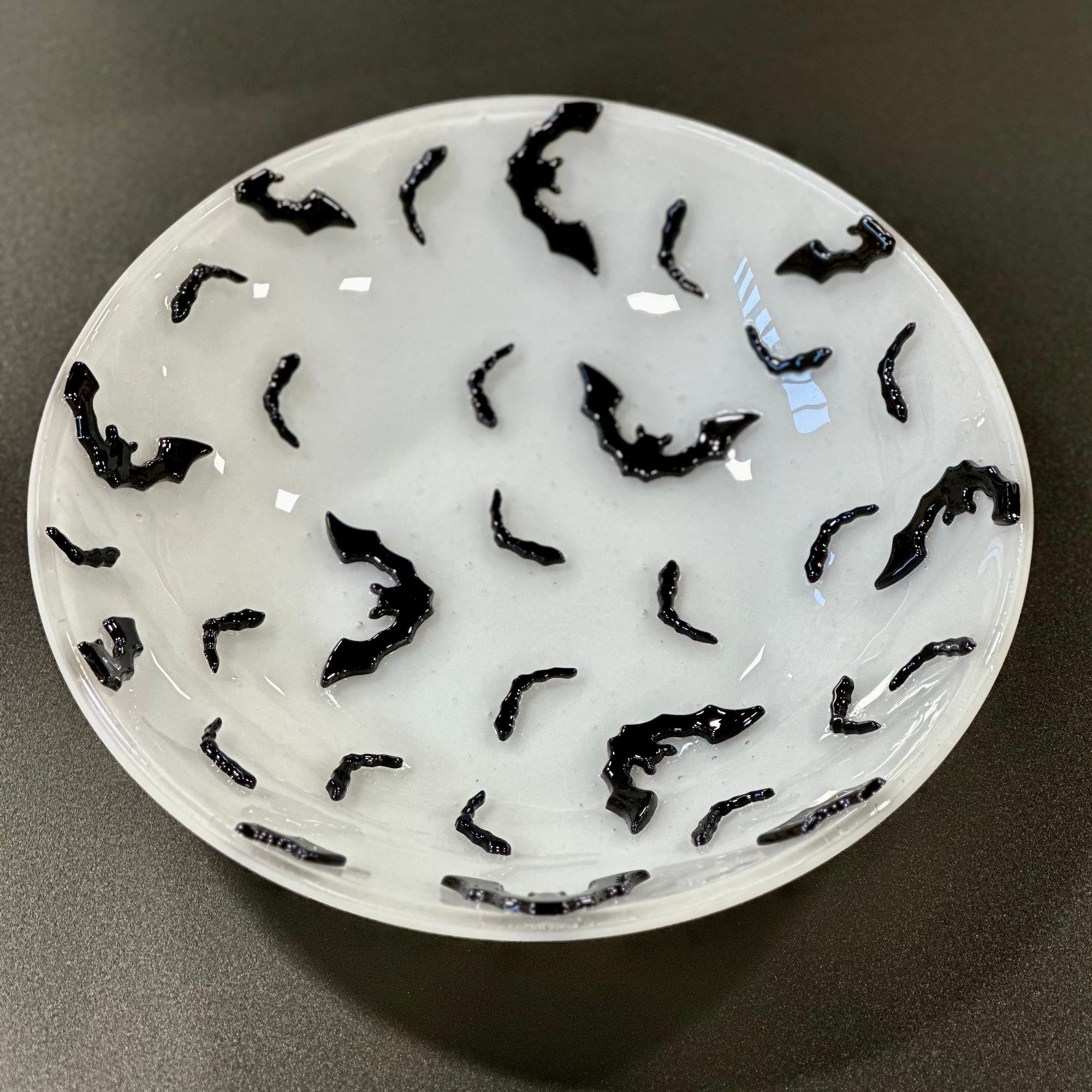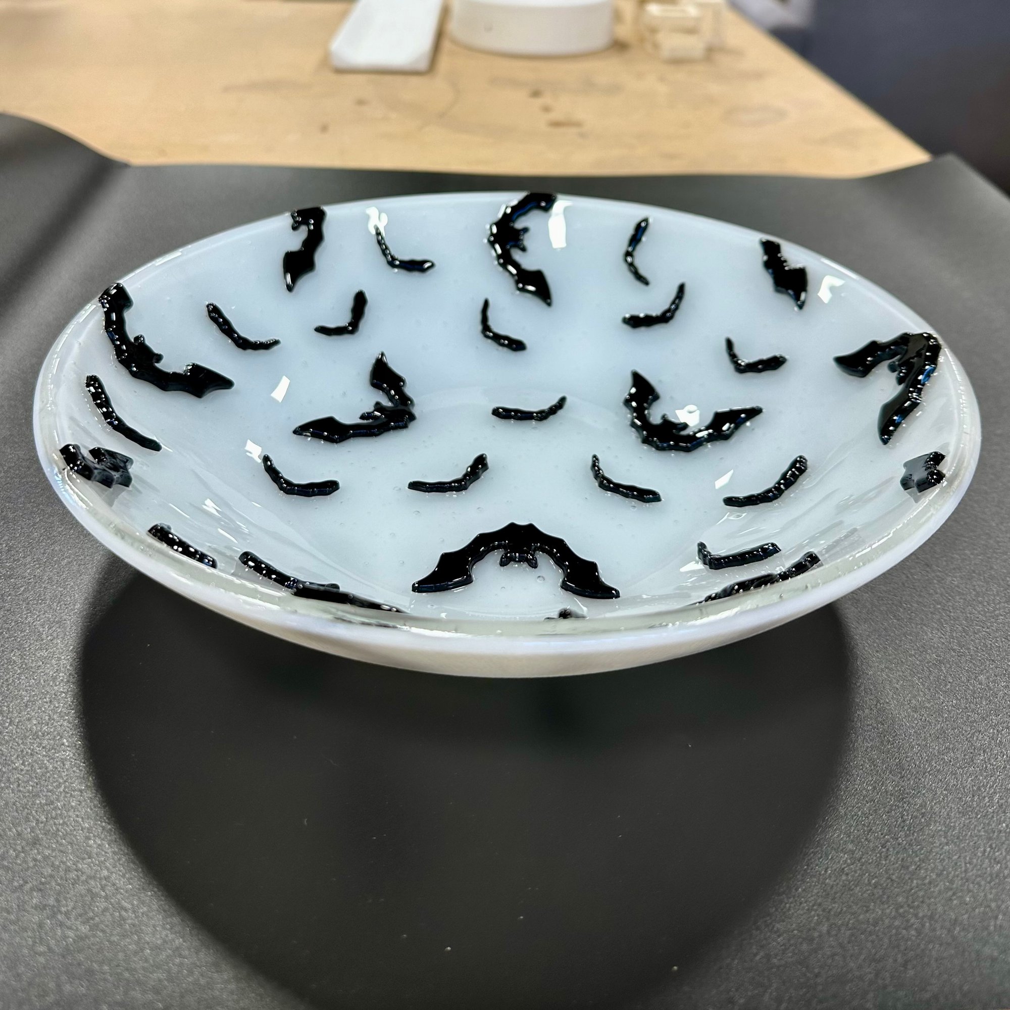 This is a handmade, fused glass, bowl that measures 12" in diameter.