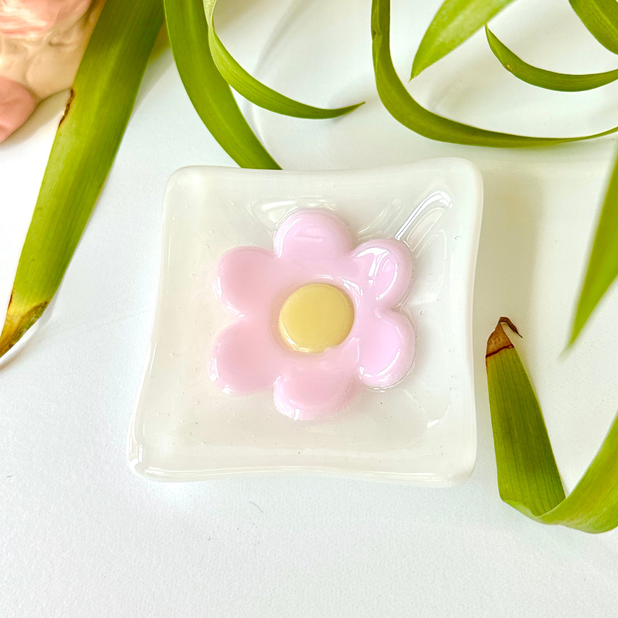 Just enough space for the little things that matter. This 2.75" fused glass dish features a single, bold daisy-bright, retro, and full of charm.