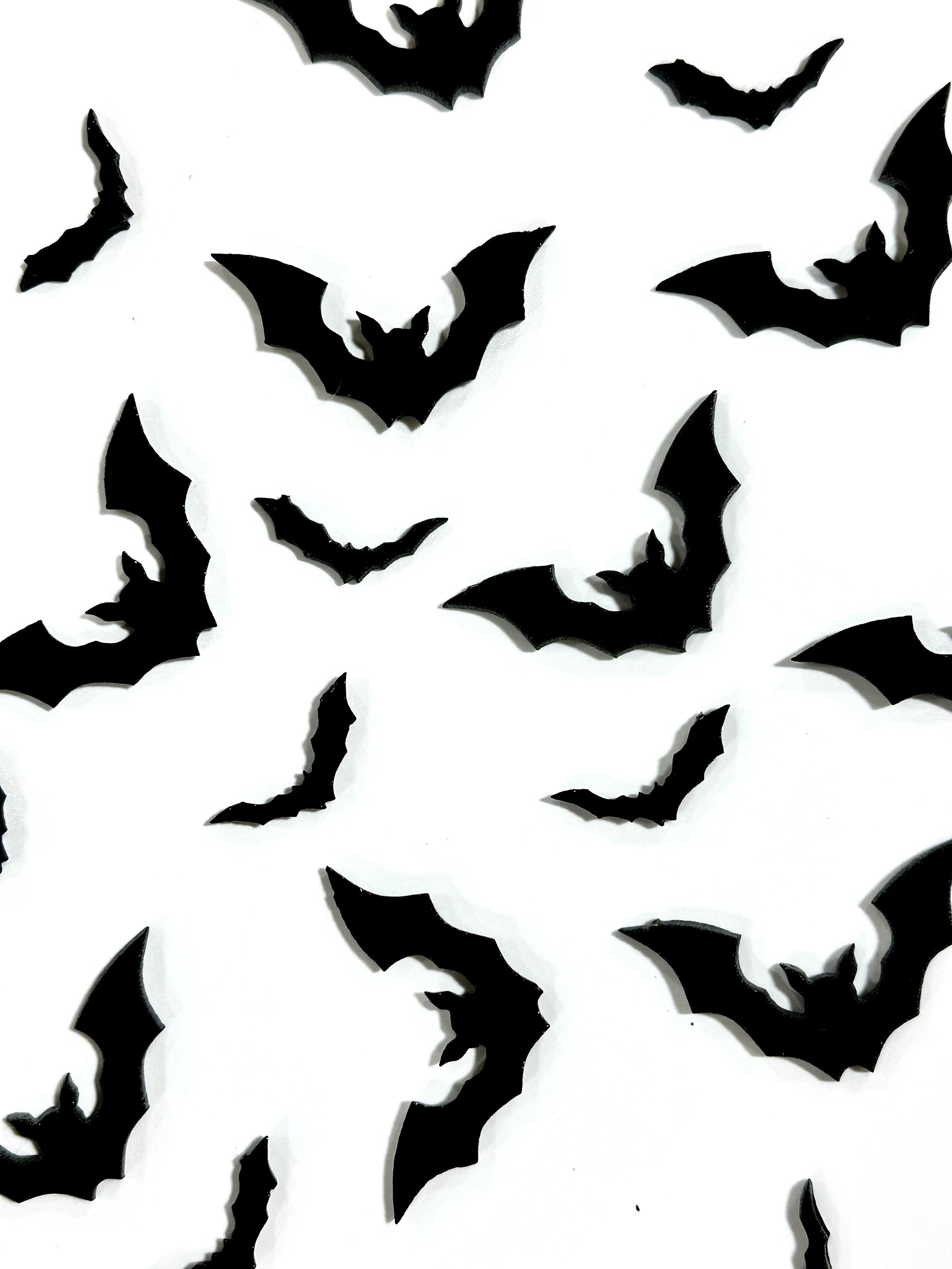These are precut bats, great for fusing and mosaic projects! They are made with Bullseye, black glass, 3 mm thick and they come in two sizes small has a wingspan of 1.25" and large are 2.25" wide.