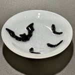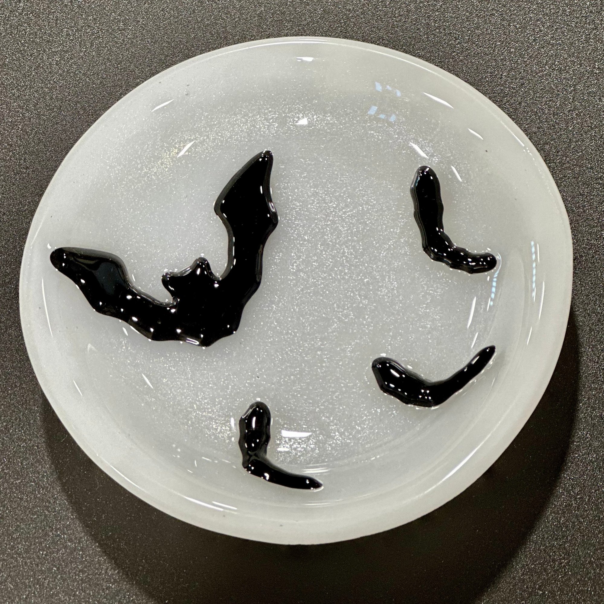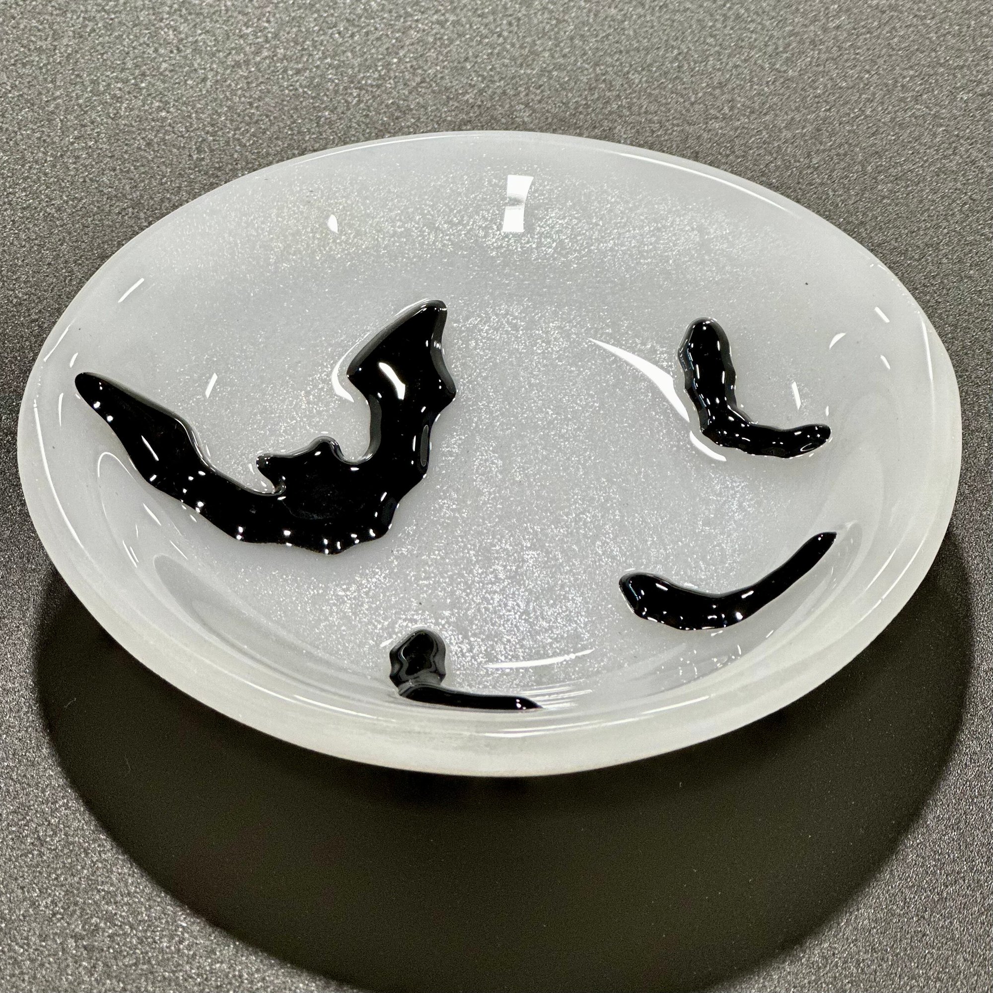 This is a handmade, fused glass dish. it measures 4.5" in diameter.