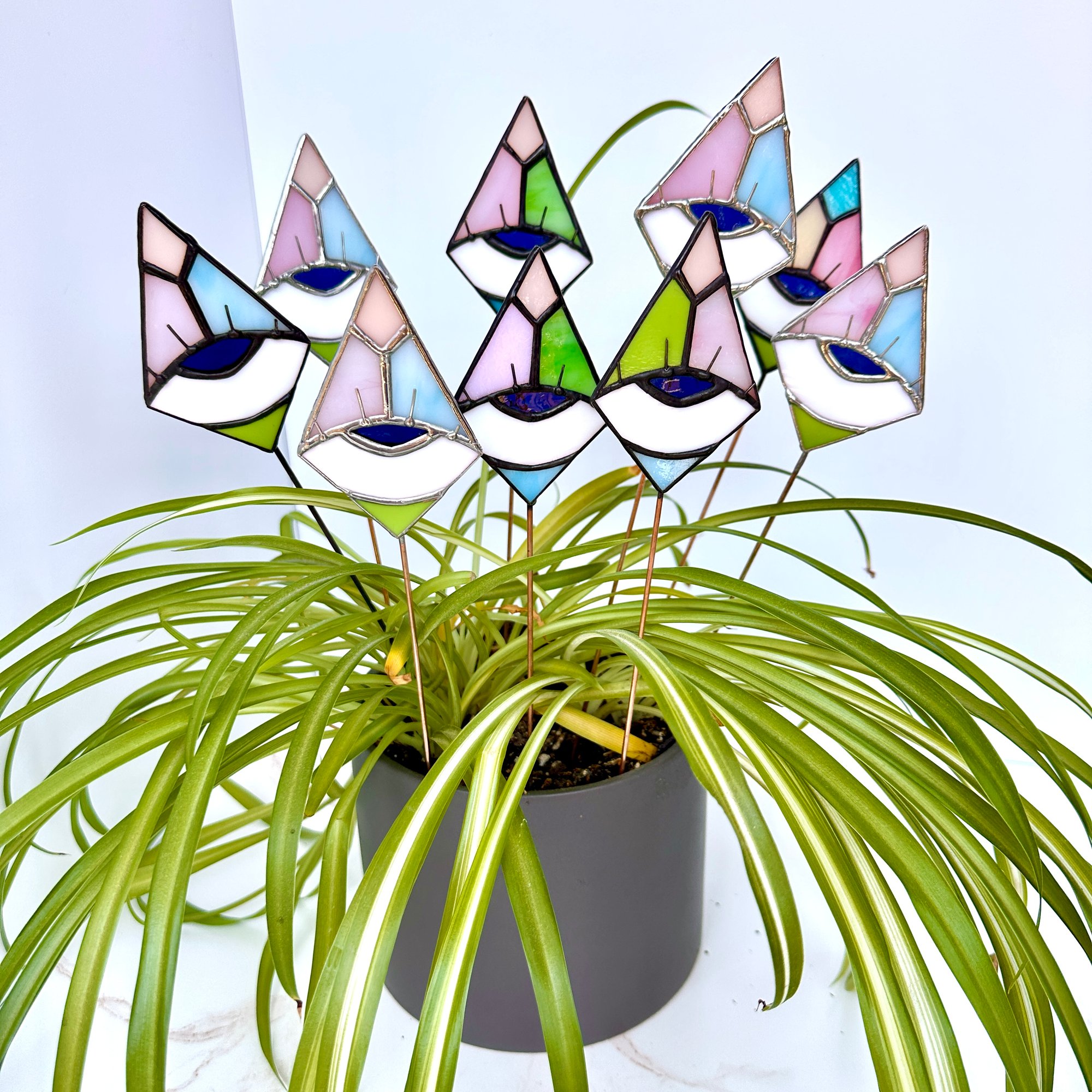These plant stakes are handmade stained glass and each piece is one-of-a-kind.