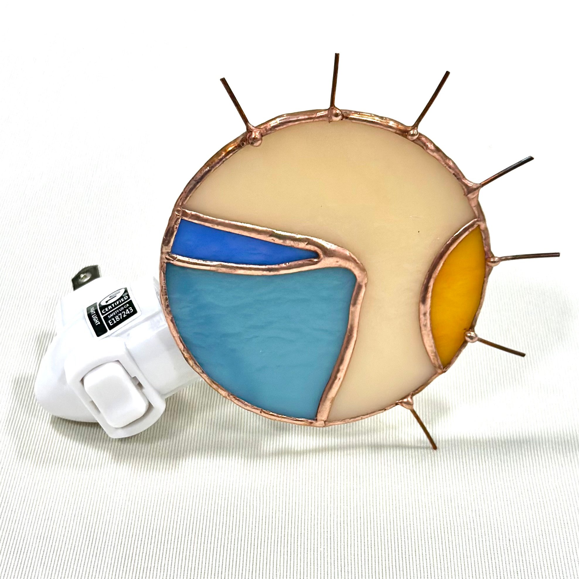 Each piece is a mini landscape in glass, glowing softly to light your hallway, bathroom, bedroom, or anywhere you need a touch of art and warmth. The copper accents catch the light beautifully, adding texture, movement, and a celestial flair.